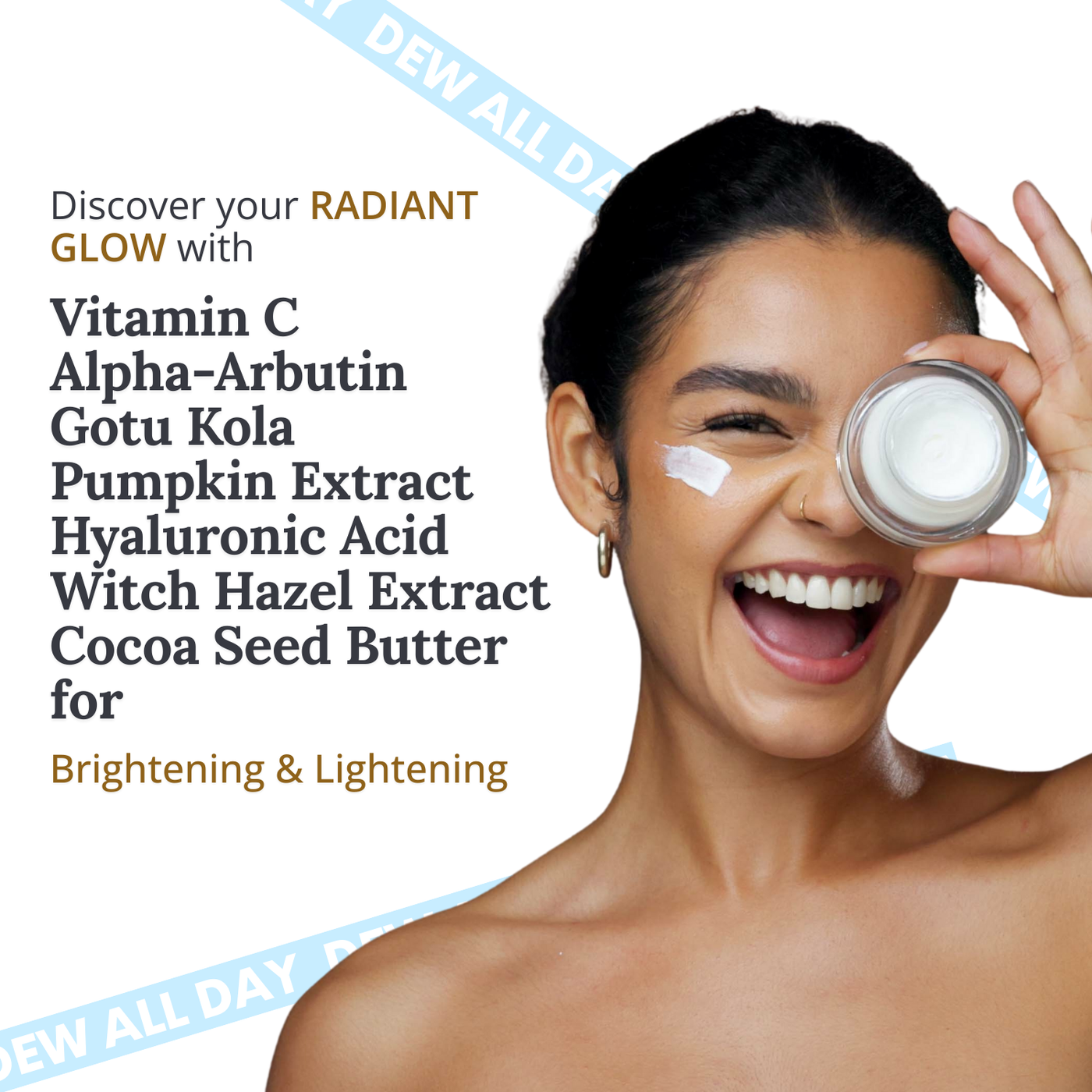 Experience the perfect day cream that does it all. Dew All Day is your daily dose of radiance, hydration, and protection in one lightweight formula. This multi-tasking marvel combines powerful brightening actives with deep hydration and built-in UV defense to give you glowing, protected skin from morning to night.