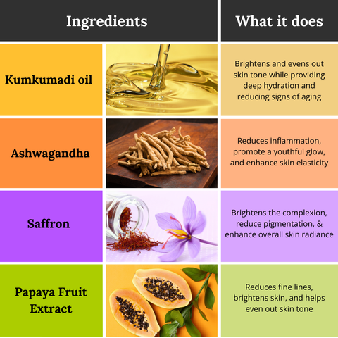 Kumkumadi Oil, Argania Spinosa (Argan) Kernel Oil, Mangifera Indica (Mango) Seed Butter , Withania Somnifera (Ashwagandha) Root Extract, Crocus Sativus (Saffron) Flower Extract, 3-O-Ethyl Ascorbic Acid, Niacinamide, Sodium Hyaluronate, Camellia Sinensis (Green Tea) Leaf Extract, Rubia Cordifolia (Indian Madder) Extract, Carica Papaya (Papaya) Fruit Extract, Rosa Damascena (Rose) Flower Water, Tocopherol Acetate (Vitamin E)